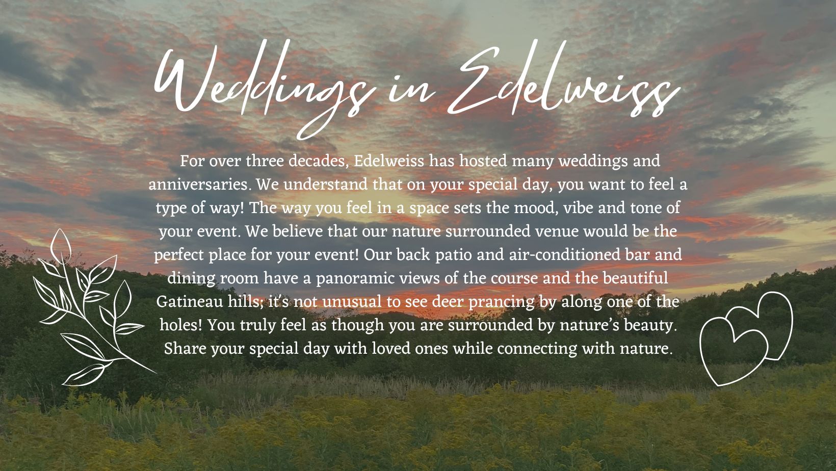 Weddings at Edelweiss provide tranquil views of the Gatineau hills and the beautiful golf course. Located less than 5 minutes outside of the artistic town, Wakefield, QC, you can find lots of accommodations and activities in the area for your friends and family.